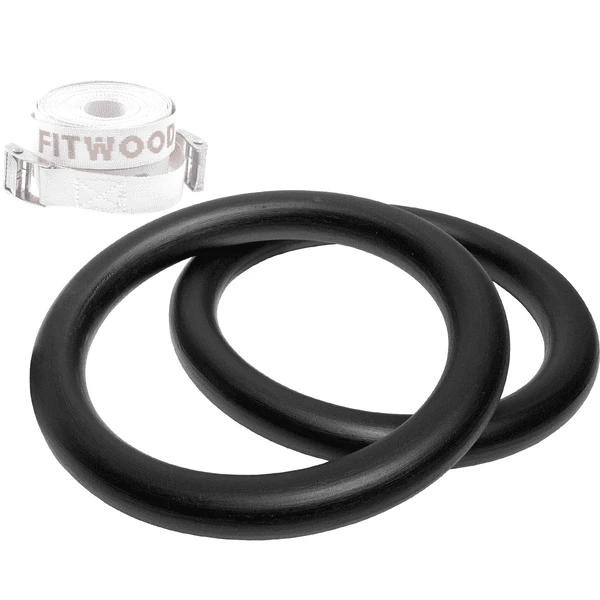 - De gymnastiekringen worden geleverd met duurzame FitWood banden waarmee de gymnastiekringen aan het plafond of bijvoorbeeld aan de AARNI wandstangen kunnen worden bevestigd.