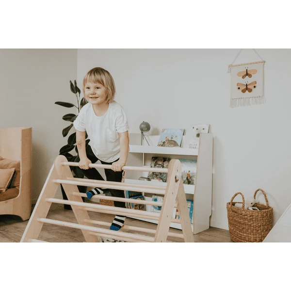 - De houten spijlen van de klimdriehoek kunnen door baby’s vanaf 6 maanden gebruikt worden om zich op te trekken en op te staan