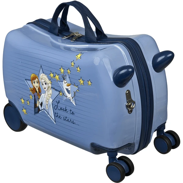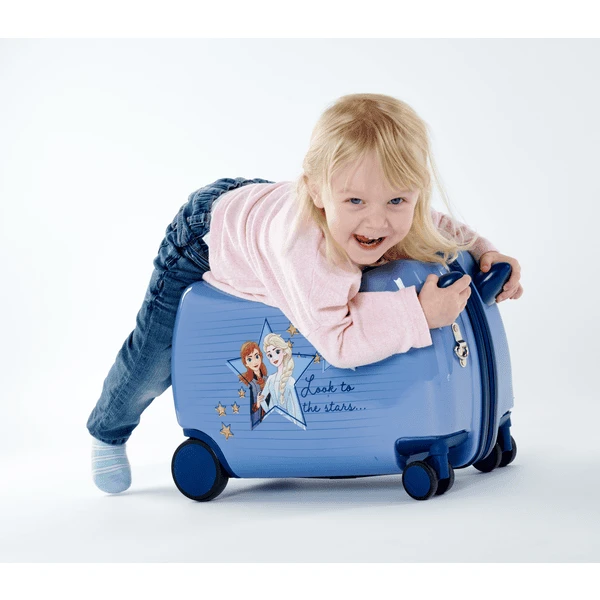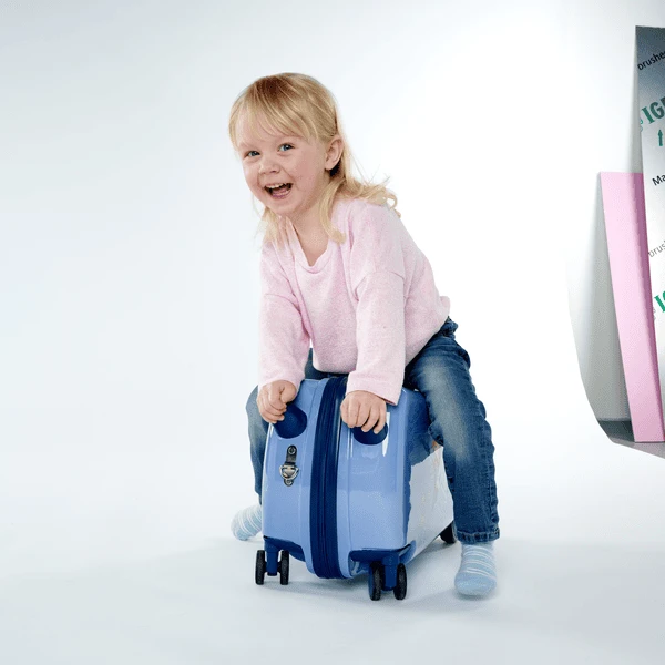 De kinderen kunnen op het wagentje zitten, zich aan de handgrepen vasthouden en het tijdens de wachttijd als schuifwagentje gebruiken. De twee 360° wielen maken de trolley bijzonder flexibel en garanderen glijplezier aan alle kanten. Bovendien biedt de trolley veel ruimte voor speelgoed en andere reisbenodigdheden dankzij de praktische indeling met ritsvak en dwarsbanden. De trolley kan comfortabel worden gedragen met de afneembare schouderriem. Bovendien kan de koffer als handbagage worden meegenomen.