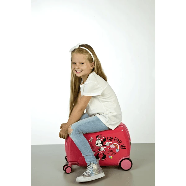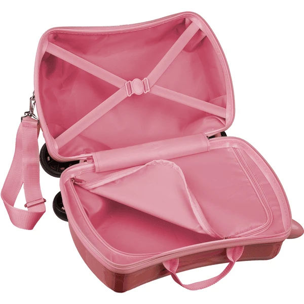 De kinderen kunnen op het wagentje zitten, zich aan de handgrepen vasthouden en het tijdens de wachttijd als schuifwagentje gebruiken. De twee 360° wielen maken de trolley bijzonder flexibel en garanderen glijplezier aan alle kanten. Bovendien biedt de trolley veel ruimte voor speelgoed en andere reisbenodigdheden dankzij de praktische indeling met ritsvak en dwarsbanden. De trolley kan comfortabel worden gedragen met de afneembare schouderriem. De koffer kan ook als handbagage worden meegenomen.